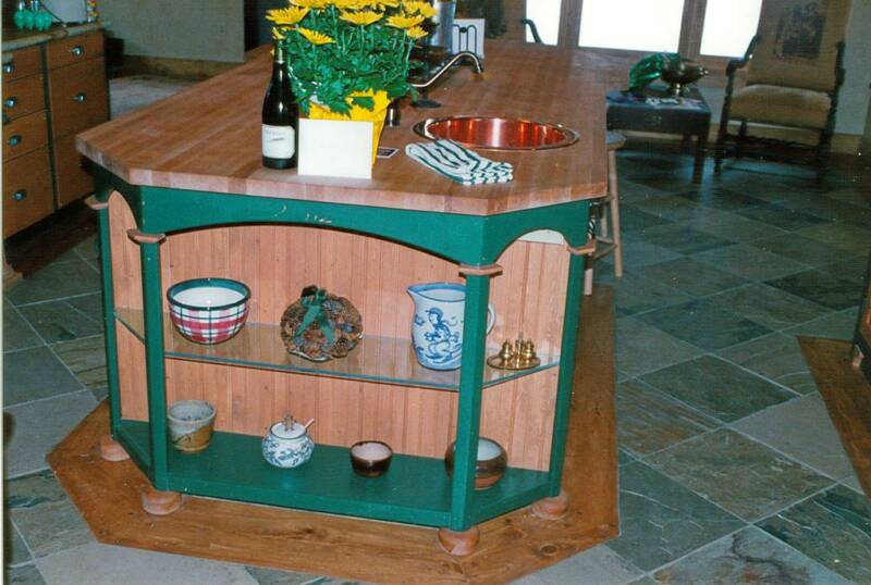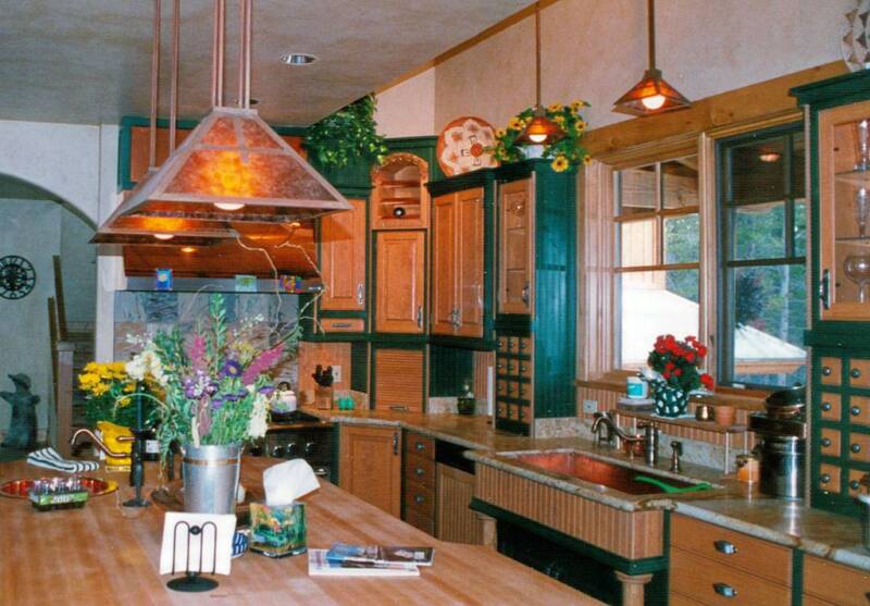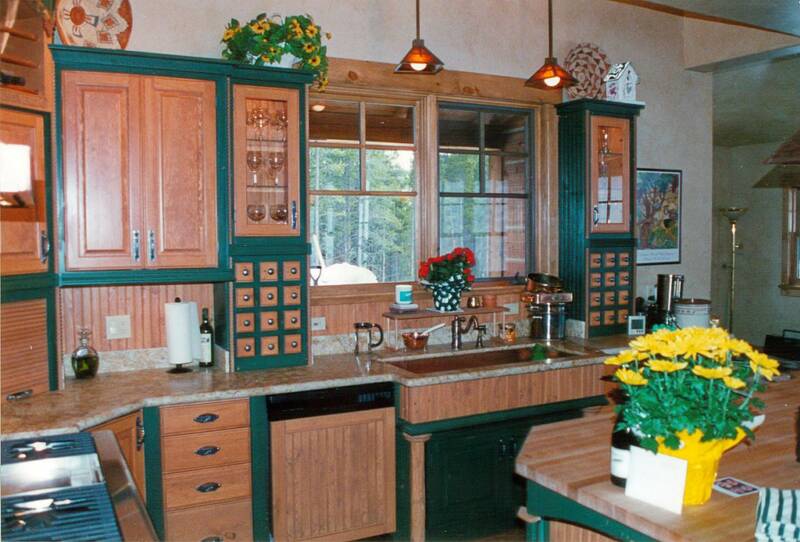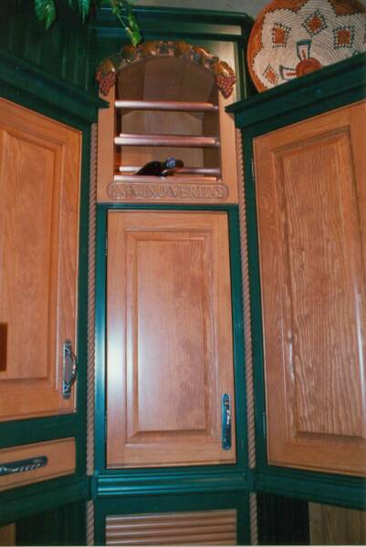 This mountain style kitchen includes carving, two stain colors, small spice drawers, custom hardware, wine racks and display areas.